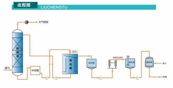 含H2S的尾氣經(jīng)二級Na2CO3處理后經(jīng)氧化塔氧化去掉有機物,水噴淋洗滌后排放。尾氣從堿噴淋塔底部進入,經(jīng)調(diào)配好一定濃度的NaCO3溶液從塔頂噴淋下來,經(jīng)氣液充分接觸,生成NaHS溶液,NaHS溶液進入氧化塔氧化,在氧化塔中,加入PDF催化劑,鼓入空氣,在催化劑的作用下,NaHS被氧化成單質(zhì)硫,溶液中的Na+離子和CO32-離子重新生成NaCO3重新循環(huán)使用。生成的單質(zhì)硫經(jīng)過連續(xù)壓濾、熔硫后生成較好品質(zhì)的硫磺。